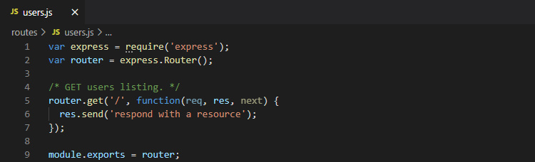 users.js์์๋ router.get('/') ๋ถ๋ถ์ด ์๋ค. app.js์์ app.use('/users', usersRouter)๋ก ์ฐ๊ฒฐํ๊ธฐ ๋๋ฌธ์ /users์ /์ด ํฉ์ณ์ ธ /users/๋ก GET ์์ฒญ์ ํ์ ๋ ์ด ๋ผ์ฐํฐ์ ์ฝ๋ฐฑ ํจ์๊ฐ ์คํ๋๋ค.