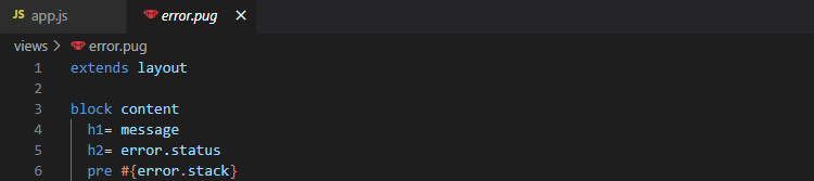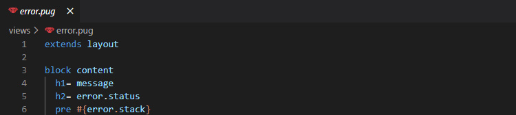 error.pug๋ block content ๋ถ๋ถ์ด layout.pug์ ์ฐ๊ฒฐ๋๋ค. ๋ผ์ฐํฐ๋ก๋ถํฐ message์ error ๋ณ์๋ฅผ ๋ฐ์ ๋ ๋๋งํ๋ค.