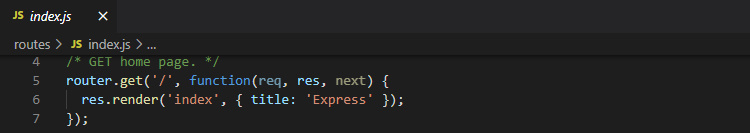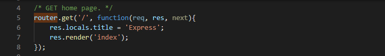 HTML๊ณผ ๋ค๋ฅด๊ฒ ์๋ฐ์คํฌ๋ฆฝํธ ๋ณ์๋ฅผ ํ ํ๋ฆฟ์ ๋ ๋๋งํ ์ ์๋ค. res.render ํธ์ถ ์ ๋ณด๋ด๋ ๋ณ์๋ฅผ Pug๊ฐ ์ฒ๋ฆฌํด์ค๋ค. routes/index.js์ ์ฝ๋๋ฅผ ๋ณด๋ฉด ๋ค์ ๋ถ๋ถ์ด ์๋ค.