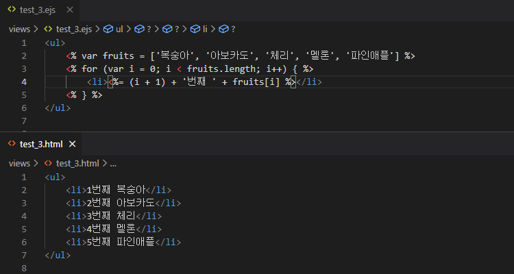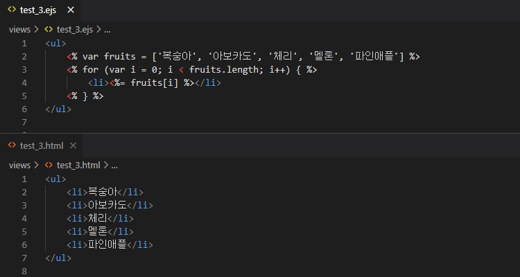 EJS์์๋ ์๋ฐ์คํฌ๋ฆฝํธ ์ฝ๋๋ฅผ <% %> ์์ ์ด๋ค. ๋ฐ๋ผ์ ๋ฐ๋ณต๋ฌธ๋ ์ด ์์ ์ฐ๋ฉด ๋๋ค. Pug์ฒ๋ผ ๋ฐ๋ก ๋ฌธ๋ฒ์ด ์๋ ๊ฒ์ ์๋๊ณ , for๋ while ๊ฐ์ ๋ฐ๋ณต๋ฌธ์ ์ฌ์ฉํ๋ฉด ๋๋ค.