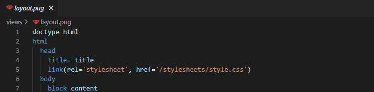 index.pug๋ฅผ ๋ณด๋ฉด extends layout๊ณผ block content๊ฐ ์๋ค. layout.pug์ block content ๋ถ๋ถ์ index.pug์ block content๋ฅผ ๋ฃ๋๋ค. index.pug๋ title์ด๋ผ๋ ๋ณ์๋ฅผ ๋ฐ์ ๋ ๋๋งํ๋ค.
