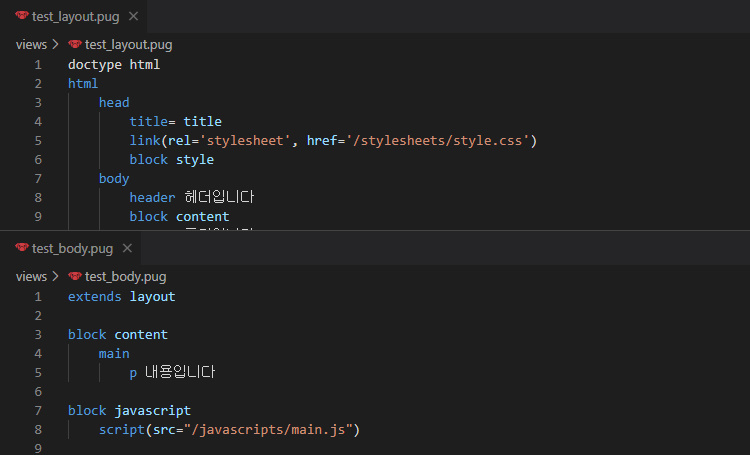 block์ด ๋๋ ํ์ผ์์๋ extends ํค์๋๋ก ๋ ์ด์์ ํ์ผ์ ์ง์ ํ๊ณ block ๋ถ๋ถ์ ๋ฃ์ด์ค๋ค. block ์ ์ธ๋ณด๋ค ํ ๋จ๊ณ ๋ ๋ค์ฌ์ฐ๊ธฐ ๋์ด ์์ด์ผ ํ๋ค. ๋์ค์ ์ต์คํ๋ ์ค์์ res, render('body')๋ฅผ ์ฌ์ฉํด ํ๋์ HTML๋ก ํฉ์ณ ๋ ๋๋งํ ์ ์๋ค. Pug ํ์ฅ์๋ ์๋ต ๊ฐ๋ฅํ๋ค. block ๋ถ๋ถ์ด ์๋ก ํฉ์ณ์ง๋ค.