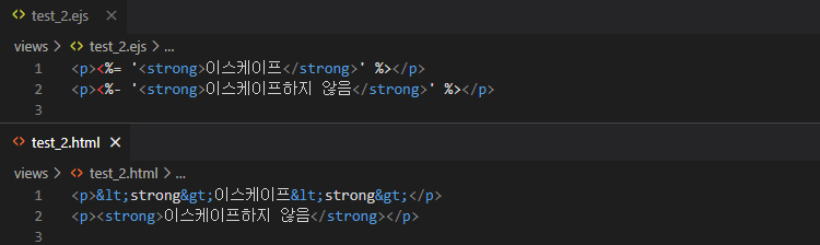 HTML์ ์ด์ค์ผ์ดํํ๊ณ ์ถ์ง ์๋ค๋ฉด <%- %>๋ก ๊ฐ์ธ์ค๋ค.