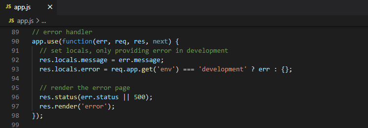์๋ฌ ์ฒ๋ฆฌ ๋ฏธ๋ค์จ์ด๋ error๋ผ๋ ํ ํ๋ฆฟ ํ์ผ์ ๋ ๋๋งํ๋ค. ๋ ๋๋ง ์ res.locals.message์ res.locals.error์ ๋ฃ์ด์ค ๊ฐ์ ํจ๊ป ๋ ๋๋งํ๋ค. res.render์ ๋ณ์๋ฅผ ๋์ ํ๋ ๊ฒ ์ธ์๋, ์ด๋ ๊ฒ res.locals ์์ฑ์ ๊ฐ์ ๋์ ํ์ฌ ํ ํ๋ฆฟ ์์ง์ ๋ณ์๋ฅผ ์ฃผ์ ํ ์ ์๋ค.