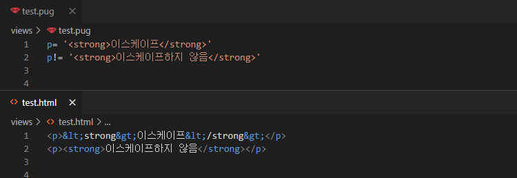 Pug๋ ๊ธฐ๋ณธ์ ์ผ๋ก ๋ณ์์ ํน์๋ฌธ์๋ฅผ HTML ์ํฐํฐ๋ก ์ด์ค์ผ์ดํํ๋ค. ์ด์ค์ผ์ดํ๋ฅผ ์ํ์ง ์๋๋ค๋ฉด = ๋์ !=๋ฅผ ์ฌ์ฉํ๋ฉด ๋๋ค.