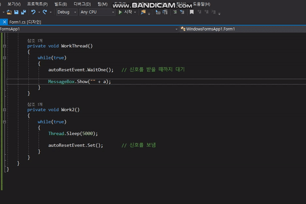 ๋ง์ฝ ์ฌ๊ธฐ์ AutoResetEvent์ ์ธ์๋ฅผ false๊ฐ ์๋ true๋ก ์ฃผ๊ฒ ๋๋ค๋ฉด, ์ฒซ ๋ฒ์งธ ์ ํธ๋ ๋ฐ์ ์ํ๋ก ์์ํ๋ค.