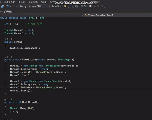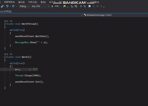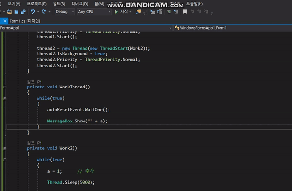 Work2()์ Thread.Sleep(5000) ๋ถ๋ถ์ด ์ ํ๋์ด 5์ด ํ์ a๊ฐ ์ถ๋ ฅ๋๋ ๊ฒ์ ํ์ธ