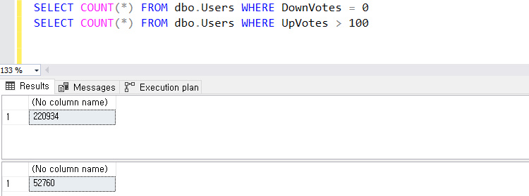 ์ด๋ ๊ฒ DownVotes = 0 ์ธ ๋ฐ์ดํฐ๋ฅผ ์ฐพ์๋๊ณ , ๊ทธ ๋ค์์ UpVotes > 100 ์ธ ๋ฐ์ดํฐ๋ฅผ ์ฐพ๊ณ ์ ํ๋ฉด,