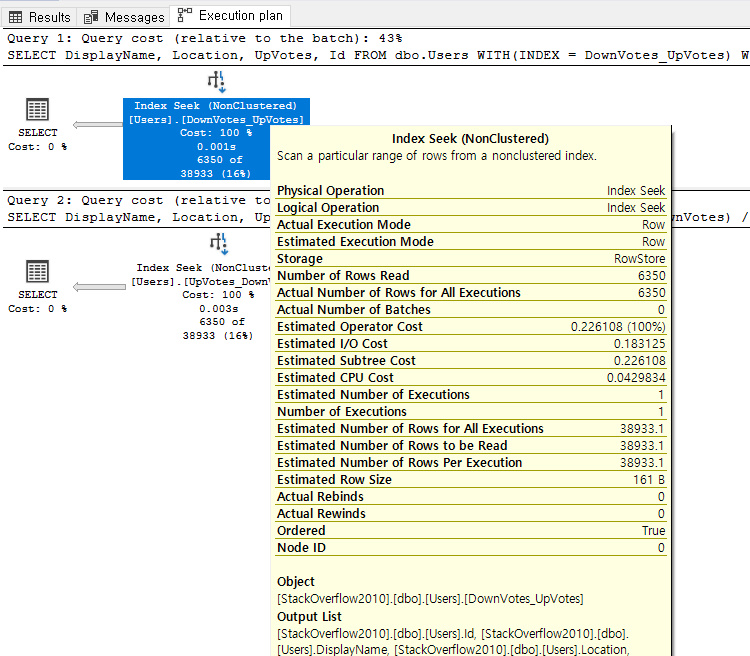 ๋ ๋ค logical reads๊ฐ 7,778์์ 3์ผ๋ก ์ค์ด๋ ๊ฒ์ ํ์ธํ ์ ์๋ค. ์คํ๊ณํ๋ ํ์ธํด๋ณด์.