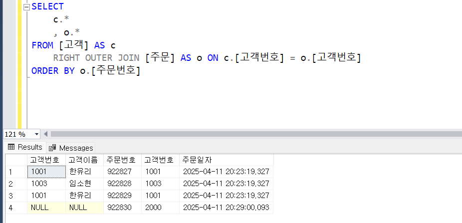 ์ฐ์ธก์ ์ฃผ๋ฌธ ํ ์ด๋ธ์ ๋ฐ์ดํฐ๋ฅผ ๋ค ๋ณด์ฌ์ฃผ๊ณ ์ข์ธก์ ๊ณ ๊ฐ ํ ์ด๋ธ์ ์กฐ์ธ ์กฐ๊ฑด์ ๋ง๋ ๋ฐ์ดํฐ๊ฐ ์์๋๋ง ๋ณด์ฌ์ค๋ค.
