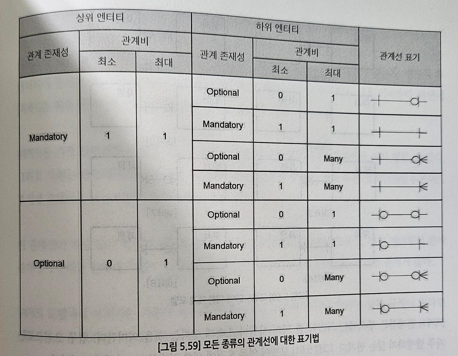 - κ΄κ³λΉ(Cardinality)λ νλμ μΈμ€ν΄μ€μ κ΄κ³μλ μλ μΈμ€ν΄μ€ κ°μλ₯Ό μλ―Ένλ€. κ΄κ³λΉλ λ³΄ν΅ μ λ°(Crow's Foot)λ‘ νμνλ€.