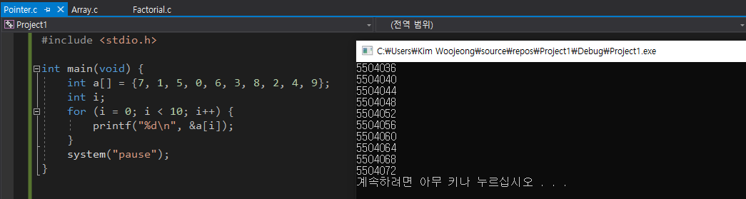 - μ£Όμκ° 4 byteμ© μ¦κ°ν¨μ νμΈ κ°λ₯ (4 byte * 10 = 40 byte μ§λ¦¬ λ°°μ΄)