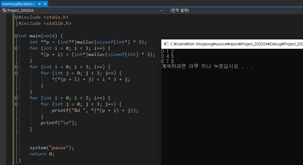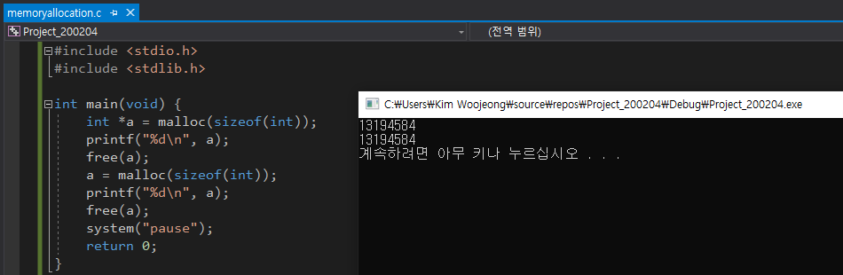 - ๋ฐ๋ฉด์ ๋์ ์ผ๋ก ํ ๋น๋ ๋ณ์๋ ๋ฐ๋์ free() ํจ์๋ก ๋ฉ๋ชจ๋ฆฌ ํด์ ๋ฅผ ํด์ฃผ์ด์ผ ํจ(malloc๊ณผ free๋ ํ ์)