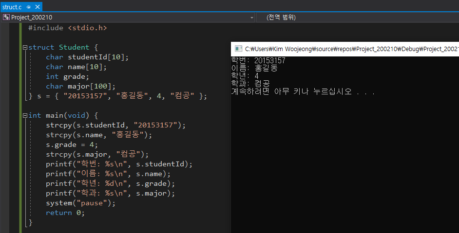 - ๊ตฌ์กฐ์ฒด์ ๋ณ์๋ฅผ ํ ๋ฒ์ ์ด๊ธฐํํ๊ธฐ ์ํด์๋ ์ค๊ดํธ์ ์ฐจ๋ก๋๋ก ๋ณ์์ ๊ฐ์ ๋ฃ์ผ๋ฉด ๋จ