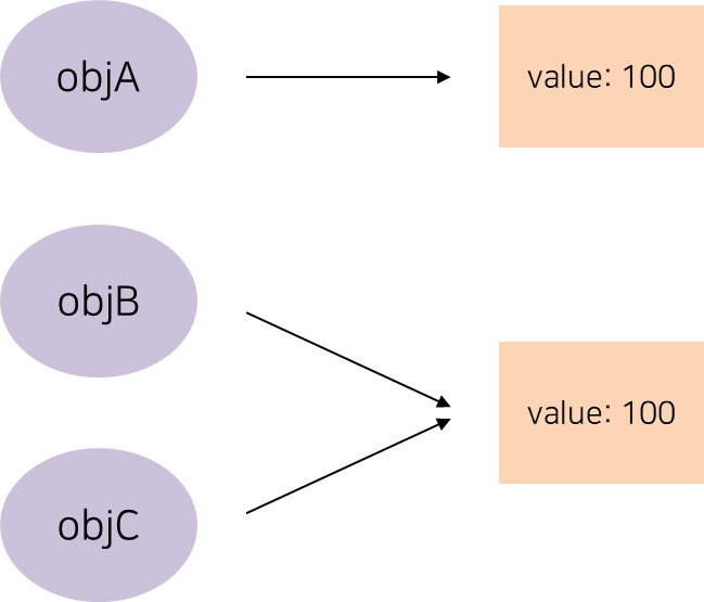 - objA์ objB๋ ๋ค๋ฅธ ๊ฐ์ฒด์ง๋ง, ๊ฐ์ ํํ์ ํ๋กํผํฐ๊ฐ์ ๊ฐ์ง๊ณ ์๋ค. ํ์ง๋ง ๋๋ฑ ์ฐ์ฐ์(==)๋ก ๋ ๊ฐ์ฒด๋ฅผ ๋น๊ตํ๋ฉด ๊ฒฐ๊ณผ๋ false๊ฐ ๋๋ค. ๊ธฐ๋ณธ ํ์ ์ ๊ฒฝ์ฐ๋ ๊ฐ ์์ฒด๋ฅผ ๋น๊ตํด์ ์ผ์น ์ฌ๋ถ๋ฅผ ํ๋จํ์ง๋ง, ๊ฐ์ฒด์ ๊ฐ์ ์ฐธ์กฐ ํ์ ์ ๊ฒฝ์ฐ๋ ์ฐธ์กฐ๊ฐ์ด ๊ฐ์์ผ true๊ฐ ๋๋ค. ๋ฐ๋ผ์ ๋ค์ ๊ทธ๋ฆผ๊ณผ ๊ฐ์ด objB์ objC๋ ๊ฐ์ ๊ฐ์ฒด๋ฅผ ์ฐธ์กฐํ๋ฏ๋ก ๋๋ฑ ์ฐ์ฐ์(==) ๊ฒฐ๊ณผ๊ฐ true๊ฐ ๋๋ ๊ฒ์ด๋ค.