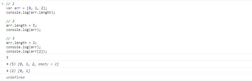 - μ΄λ²μλ length νλ‘νΌν° κ°μ 2λ‘ μ€μ νλ€. μ΄ κ²½μ°μλ length νλ‘νΌν°λ₯Ό λ²μ΄λλ 2λ²μ§Έ μΈλ±μ€ κ°μΈ '2'κ° μ€μ λ‘ μμ λλ€. λλ¬Έμ console.log(arr[2]) κ°μ΄ undefinedλ‘ μΆλ ₯λλ κ²μ΄λ€.
