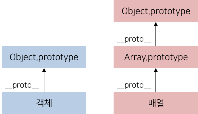 - κ°μ²΄ 리ν°λ΄ λ°©μμΌλ‘ μμ±ν κ°μ²΄μ κ²½μ°, κ°μ²΄ νμ€ λ©μλλ₯Ό μ μ₯νκ³ μλ Object.prototype κ°μ²΄κ° νλ‘ν νμ μ΄ λλ€. λ°λ©΄μ λ°°μ΄μ κ²½μ° Array.prototype κ°μ²΄κ° νλ‘ν νμ μ΄ λλ©°, Array.prototypeμ νλ‘ν νμ μ Object.prototype μ΄ λλ€.