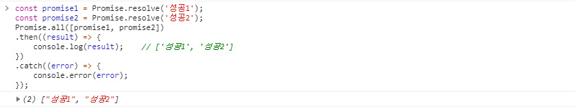 - ํ๋ก๋ฏธ์ค๊ฐ ์ฌ๋ฌ ๊ฐ ์์ ๋ Promise.all์ ๋ฃ์ผ๋ฉด ๋ชจ๋ resolve๋ ๋๊น์ง ๊ธฐ๋ค๋ ธ๋ค๊ฐ then์ผ๋ก ๋์ด๊ฐ๋ค.